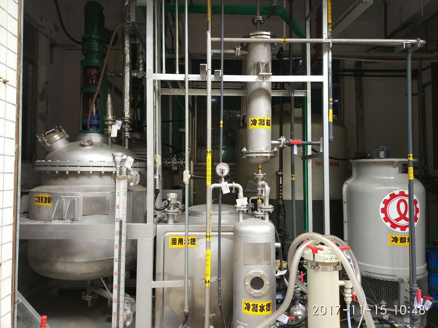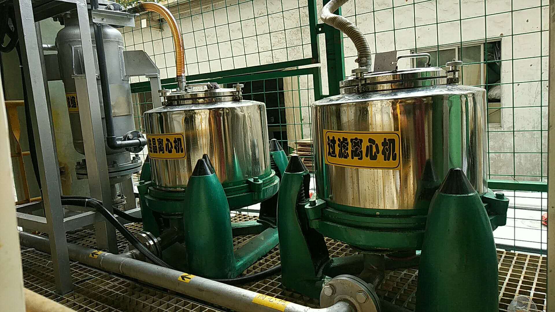 在反應(yīng)釜內(nèi)的濃液被濃縮到飽和時(shí),會(huì)有晶體析出,含晶體的混合液由泵打入離心機(jī)2中進(jìn)行固液分離,卸出的固體物質(zhì)委外處理,另外的飽和液回流至濃液槽中再次進(jìn)入蒸發(fā)器中。而蒸發(fā)出的蒸汽通過(guò)冷凝器進(jìn)行冷卻后,形成冷凝水,進(jìn)入回用水箱中,進(jìn)入車間回用。